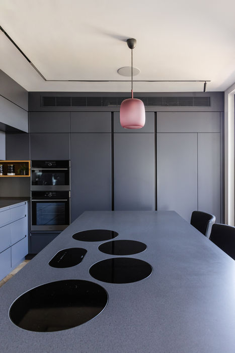 המטבח תוכנן כפונקציונלי ויוקרתי, עם אלמנטים אינטגרליים, מקרר יינות, חיפוי מגנטי ומשטח בעבודת יד מבית למבורגיני איטליה. פינת עבודה תוכננה בין חדרי הילדים, עם אפשרות להפרדה באמצעות פרופיל בלגי.